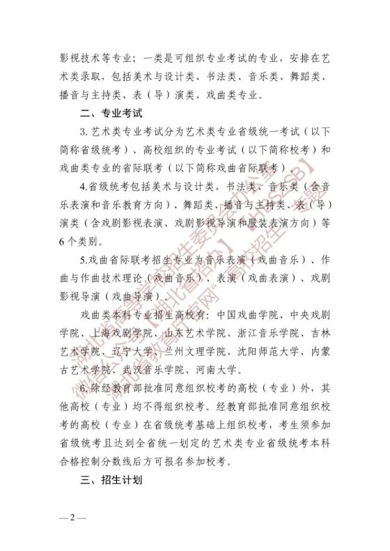 2.藝術類專業分為兩類:一類是不組織專業考試的專業,安排在普通類錄取,包括藝術史論、藝術管理、非物質文化遺產保護、戲劇學、電影學、戲劇影視文學、廣播電視編導、影視技術等專業;一類是可組織專業考試的專業,安排在藝術類錄取,包括美術與設計類、書法類、音樂類、舞蹈類、播音與主持類、表(導)演類、戲曲類專業。