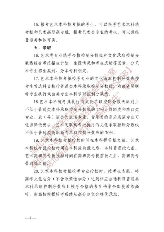 16.藝術類專業統考合格控制分數線和文化錄取控制分數線綜合考慮招生計劃、生源情況和考生成績等因素,分藝術專業招生類別、分本專科劃定。
