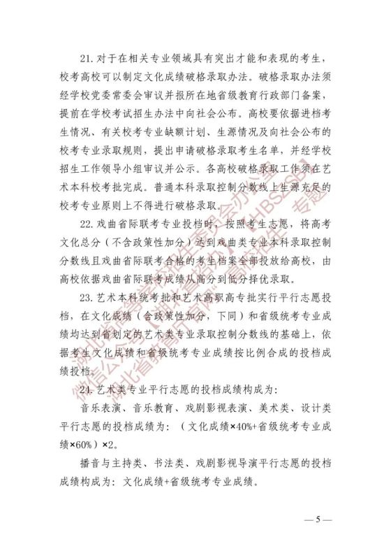 21.對于在相關專業領域具有突出才能和表現的考生,校考高校可以制定文化成績破格錄取辦法。破格錄取辦法須經學校黨委常委會審議并報所在地省級教育行政部門備案,提前在學校考試招生辦法中向社會公布。高校要依據進檔考生情況、有關校考專業缺額計劃、生源情況及向社會公布的校考專業錄取規則,提出申請破格錄取考生名單,并經學校招生工作領導小組審議并公示。各高校破格錄取工作須在藝術本科校考批完成。普通本科錄取控制分數線上生源充足的校考專業原則上不得進行破格錄取。