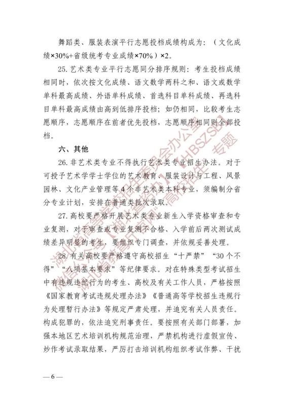 28.有關高校要嚴格遵守高校招生“十嚴禁”“30個不得”“八項基本要求”等紀律要求。對在特殊類型考試招生中有違規違紀行為的考生、高校及有關工作人員,嚴格按照《國家教育考試違規處理辦法》《普通高等學校招生違規行為處理暫行辦法》等規定嚴肅處理,并追究有關人員責任。構成犯罪的,依法追究刑事責任。要按照有關部門部署,加強本地區藝術培訓機構規范治理,嚴禁機構進行虛假宣傳、炒作考試錄取結果,嚴厲打擊培訓機構組織考試作弊、干擾考試招生秩序等違規違法行為。