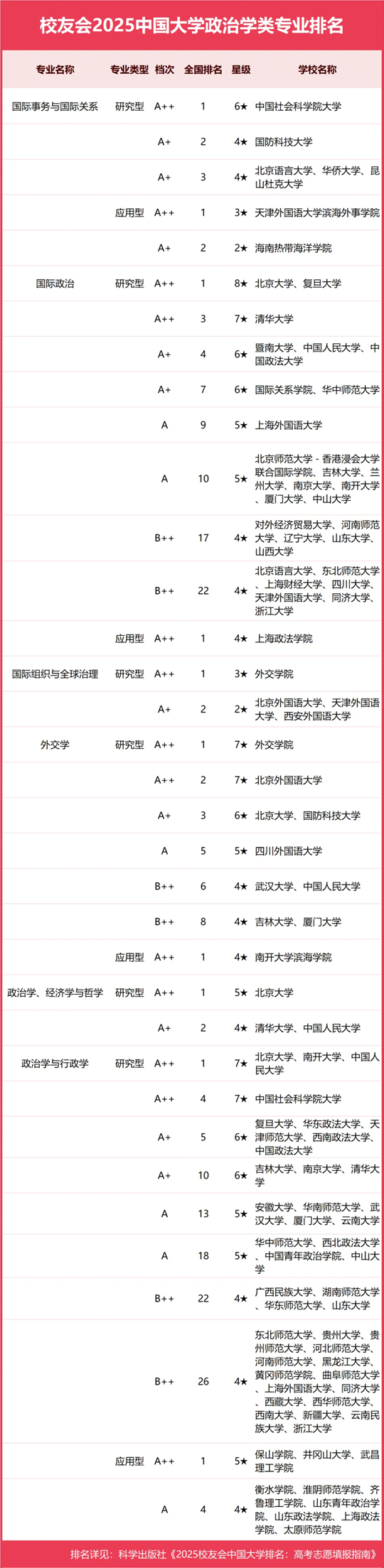 | 校友會2025中國大學政治學類專業排名,外交學院、武昌理工學院第一 |