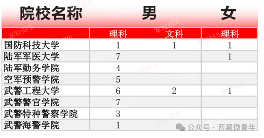 5.軍隊院校招生工作由國家和軍隊相關部門統一組織實施,在藏招生工作由西藏軍區招生工作辦公室和西藏自治區教育考試院等部門依據職責負責,不會向考生收取任何費用,請廣大考生和家長增強防騙意識。