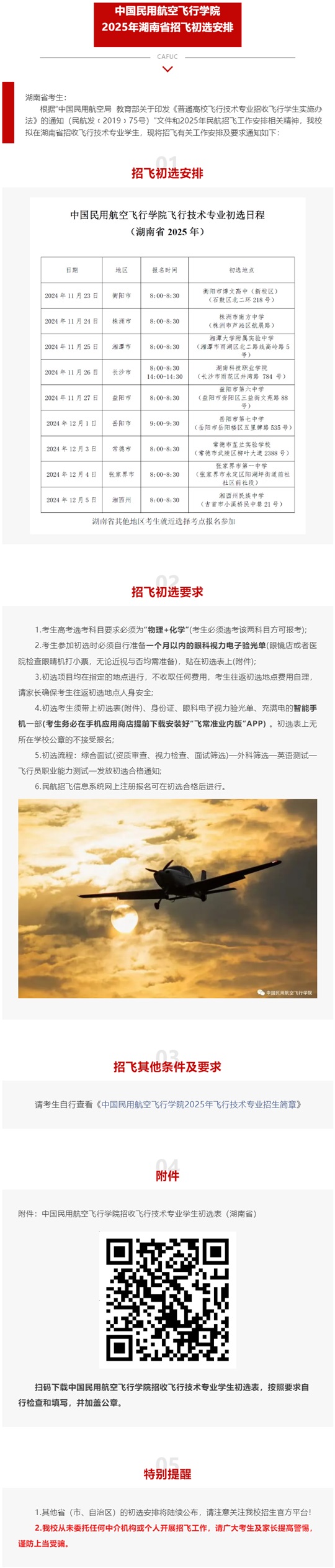 中國(guó)民用航空飛行學(xué)院2025年湖南省招飛初選安排