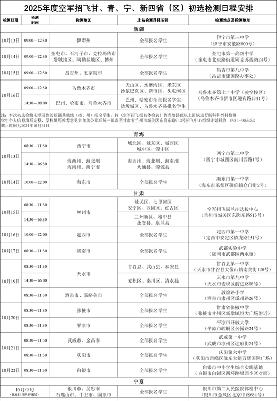| 2025年度空軍招飛甘、青、寧、新四省(區)初選檢測安排 |