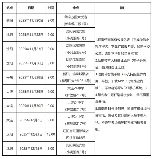 注:1.整體選拔安排說明:招飛相關(guān)環(huán)節(jié)安排綜合測試,包括但不限于飛行職業(yè)能力傾向測試、英語測試、綜合面試等考核,通過人員方可進入后續(xù)環(huán)節(jié),具體安排以當(dāng)?shù)啬虾秸酗w辦通知為準(zhǔn)。