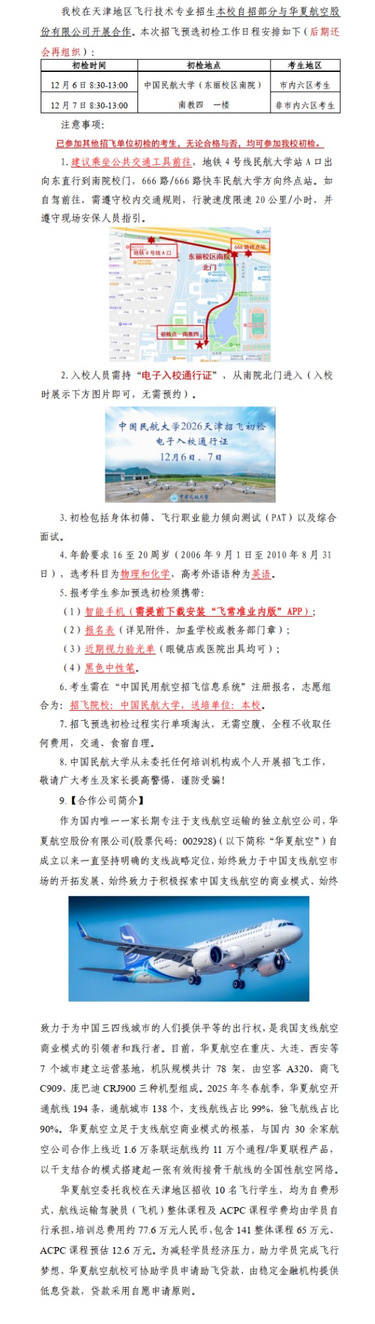 | 中國民航大學:天津地區2026年招飛預選初檢安排(本校自招部分)-招飛信息網 |