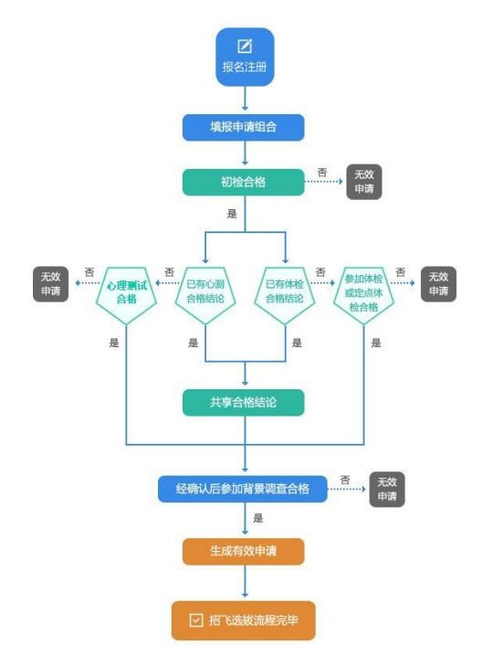 為幫助您在招飛選拔過程中節約時間和費用,便于您更好地備考,同時讓您有機會在更多的合格申請組合中選擇確認有效招飛申請,系統對部分環節的結論在特定情況下設定了結論共享。請注意,這里的結論共享特指申請組合之間共享。