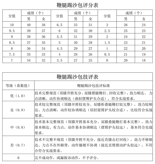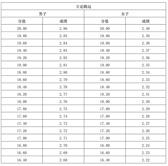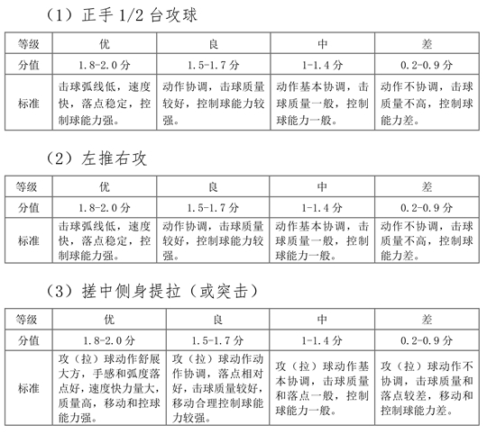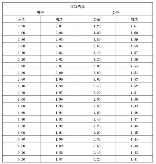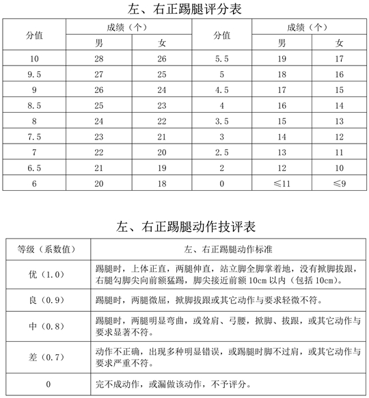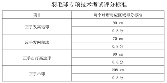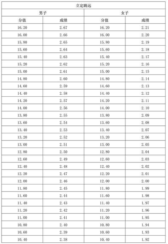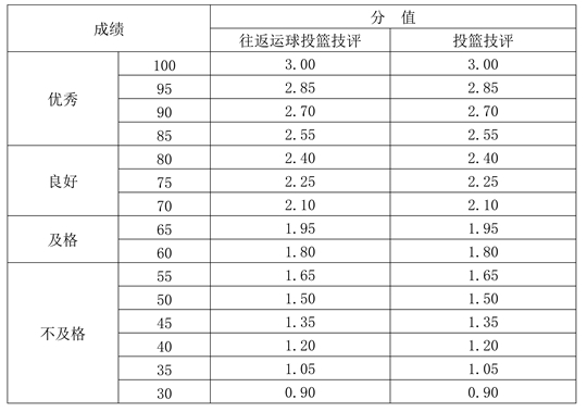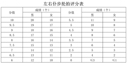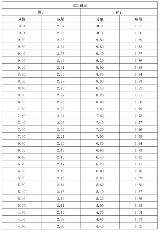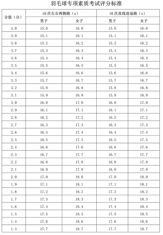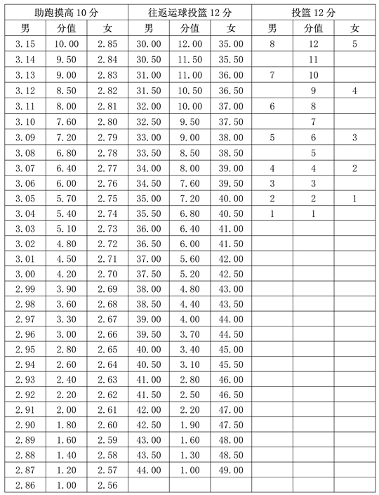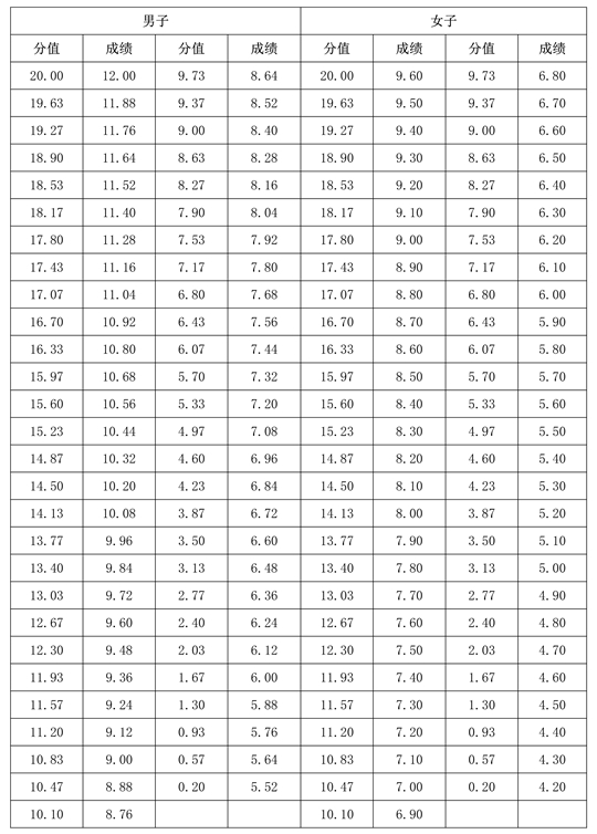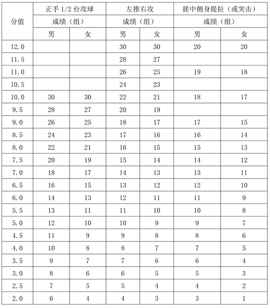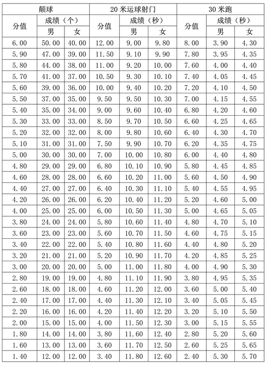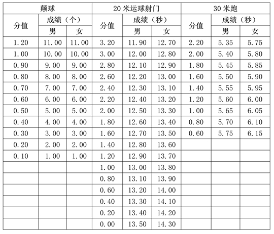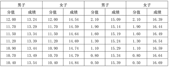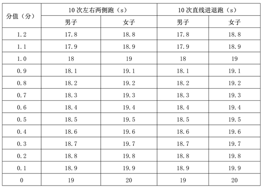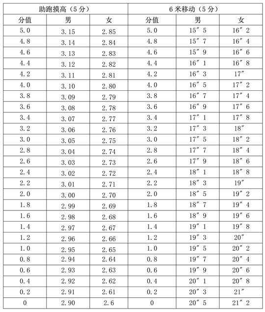 專項素質滿分為12分。每項測驗內容達到要求者可得評分表規定的滿分。達不到要求者視其情況扣分。其中達標項目評分標準為: