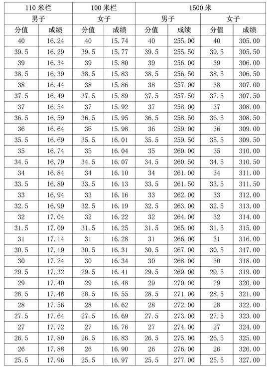 2.男子110米欄、女子100米欄、1500米跑評分表(單位:秒)