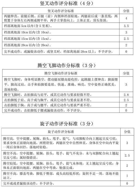 3.體操專項總分按40分計算,其中專項素質占12分,規定動作占28分,自選動作不計分。考生專項素質和規定動作得分的總和即為體操專項總分。