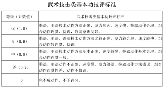 a.姿勢正確,方法清楚;身體協調,勁力順達,力點準確;精神貫注,節奏分明;內容充實,風格突出者,不扣分。b.與要求輕微不符者,扣0.1-1分,c.與要求顯著不符者,扣1.1-2分,d.與要求嚴重不符者,扣2.1-3分,e.完不成動作中途退場者,不于評分。f.完成套路的時間不足40秒(太極拳不足1分30秒),每少0.1秒至2秒扣0.1分,每少2.1秒至4秒扣0.2分,依此類推。
