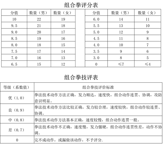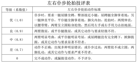 考生可以選擇任何一種拳或器械套路進行測試,但所選套路的內容要充實,并符合所選套路的待點,完成套路的時間不得少于40秒(太極拳不得少于1分30秒)。考評員根據考生完成套路動作的質量,按5分制進行評分(詳情參考最新《國際武術套路競賽規則》)。