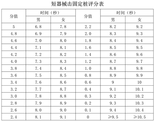 a.用器械(短兵)全長90cm,打六個固定樁(樁高170cm、直徑40cm)。固定樁分成兩排,一排三個,兩排距離4米,每兩個相鄰樁距離2米,成“Z”字形排列。每個樁分別打頭、軀干、大腿三個固定點。考生站在出發臺前,前腳踏住計時啟動器,準備好后聽口令自己啟動計時器,按順序打完三個樁的固定點后,自己停計時器,回到出發臺。所用時間換算成分數就是考生的最終分數,每個考生考2次,取最好成績。考生打樁所用的移動方法不限,漏掉任意一個點扣1分,依次遞減,直至清零,得分標準和考試方法見下表。