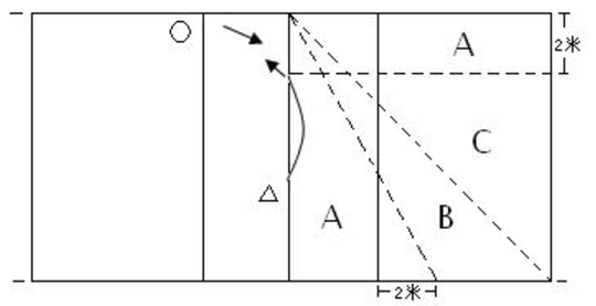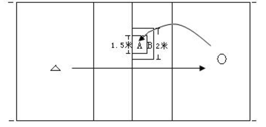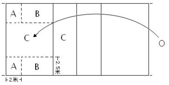 如圖所示。教師在對方場區側手發球,考生在后場區6號位接10個發球。要求墊球弧度不低于球網,若球的飛行弧度低于球網上沿,則在相應得分中扣去0.3分