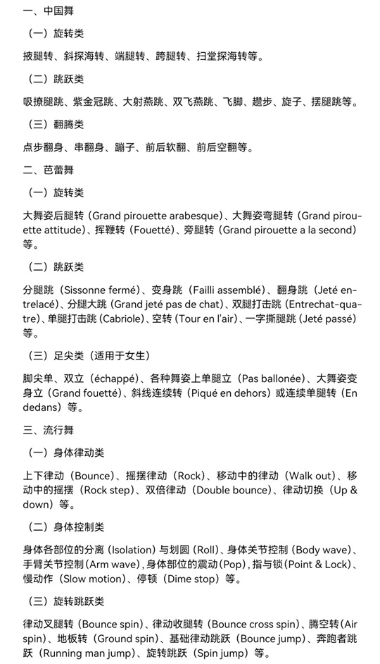 (4)個(gè)人技術(shù)技巧部分內(nèi)容:跳、轉(zhuǎn)、翻單一動(dòng)作展示,總時(shí)長不超過1分鐘。附件中所列的技術(shù)技巧動(dòng)作供考生參考。