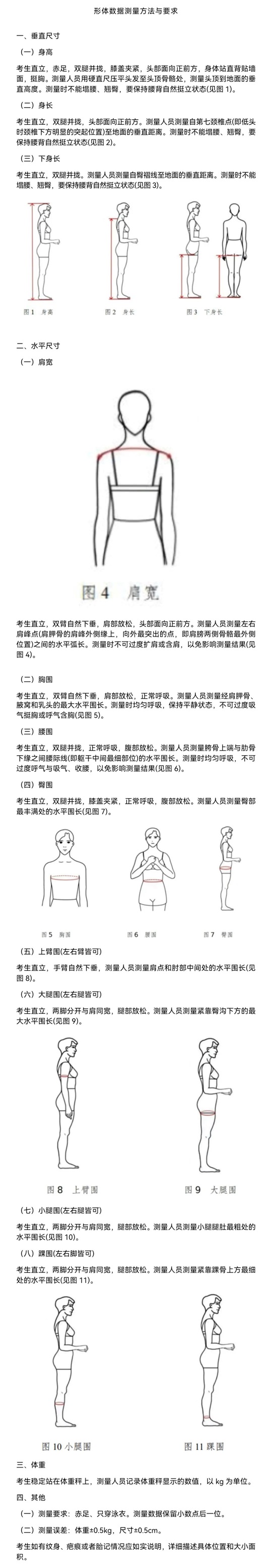 (2)考試形式與要求:考生先完成形體測(cè)量(測(cè)量方法與要求附后),然后5-10位考生為一組進(jìn)行正面、側(cè)面、背面體態(tài)展示:要求赤足、著泳裝,其中女生著純色、分體、不帶裙邊泳裝,男生著純色泳褲。