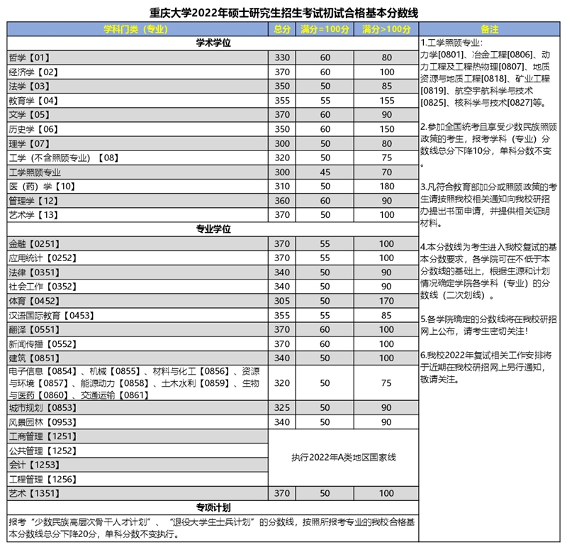 重慶大學(xué)2022年碩士研究生招生考試初試合格基本分?jǐn)?shù)線
