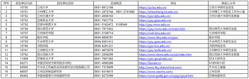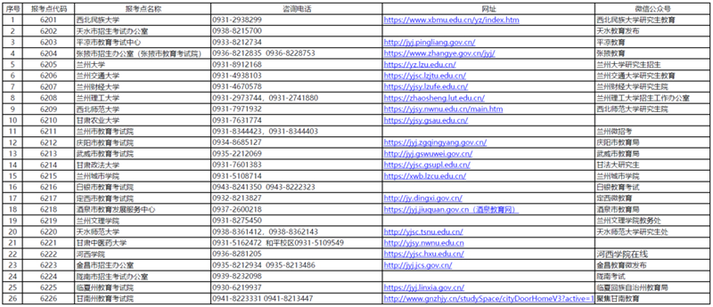 | 甘肅省2026年全國碩士研究生招生考試各招生單位和報考點聯系方式 |