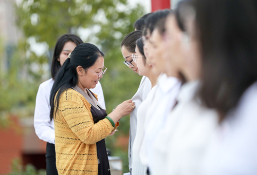 隨后,校黨委副書記、執(zhí)行校長(zhǎng)徐愛(ài)民,組織部部長(zhǎng)黃巖及青島第五屆高校教學(xué)名師獲得者莊新穎、單菁華為新進(jìn)教師佩戴校徽。