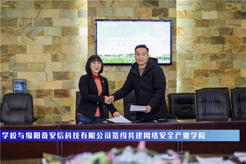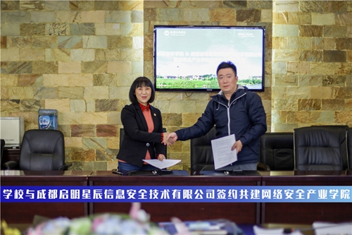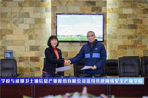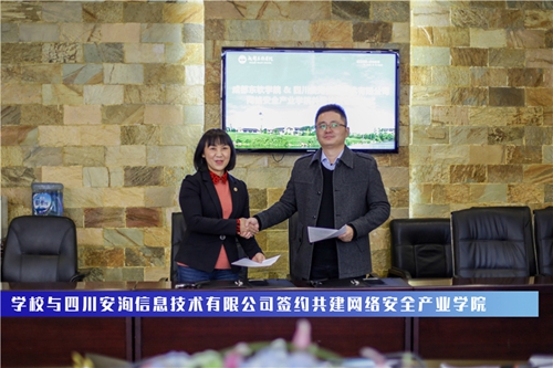 1月12日上午,成都東軟學院與成都啟明星辰信息安全技術有限公司、成都衛士通信息產業股份有限公司、綿陽奇安信科技有限公司、四川安洵信息技術有限公司、神州綠盟成都科技有限公司、沈陽東軟系統集成工程有限公司達成共建“成都東軟學院網絡安全產業學院”協議,并于第二會議室進行了簽約儀式。出席本次儀式的嘉賓有四川安洵公司總經理陳誠、成都啟明星辰安全公司副總經理羅春、成都衛士通信息產業公司安全服務事業部總經理葉定松、綿陽奇安信校企合作市場總監張波、綠盟科技總部安全服務中心高級經理李媛媛及沈陽東軟系統集成工程有限公司副總經理張泉。成都東軟學院副校長康桂花、計科系主任寧多彪和校企多方相關部門代表、學校教師代表也出席了儀式現場。
