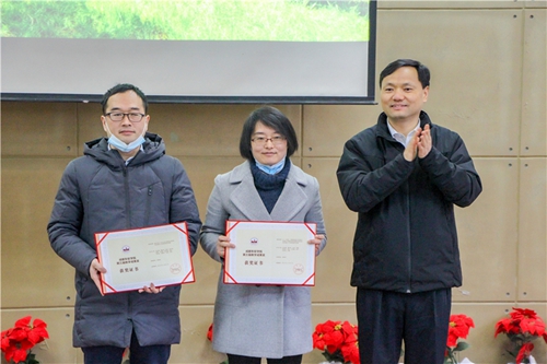康桂花副校長宣布學校2020年課堂教學名師獲得者名單,張應輝校長、張憲民副書記為獲獎教師頒獎。