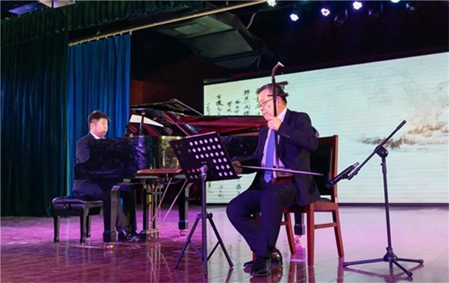 晚上7時,全省第六屆大學生藝術展演獲獎節目《盛世國樂》為晚會拉開序幕,來自公共藝術教育中心的4位青年教師與學生們共同合奏,整個樂曲音色典雅、古韻十足、氣勢磅礴,將幾千年前的中華盛世樂曲魅力表現的淋漓盡致,讓師生感受到一段深情并茂的民樂散文。