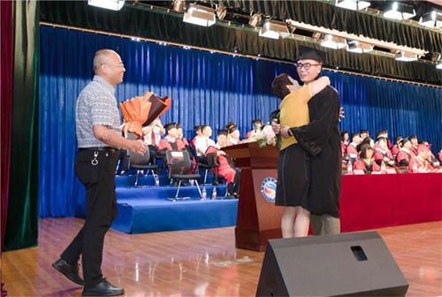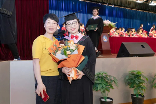 紅領黑緞,流蘇飛綠,在代表“教育的崇高和知識圣潔”的學位權杖見證下,畢業生代表一一向導師鞠躬,并從導師手中接過學位證書。主席臺一側,學生家長和師生依次迎接畢業生,獻上鮮花表示祝賀。現場氣氛隆重而感人。