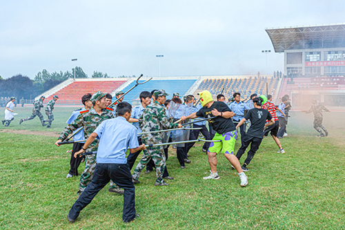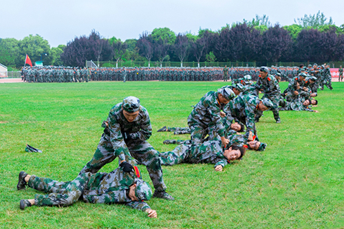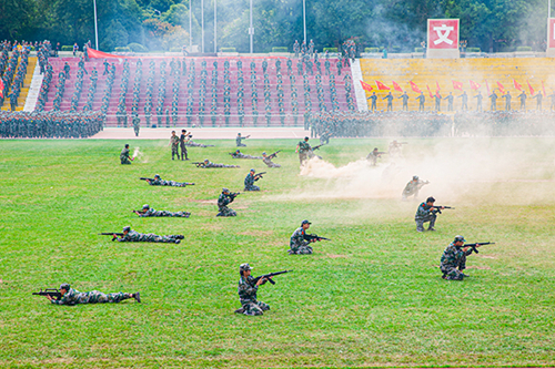 匯報表演環節,隊列展示、擒敵拳、戰術、花樣隊列等科目依次登場。隊列展示方隊以整齊劃一的步伐展現了優秀的單兵素質,健壯有力的臂膀仿似鐵鑄,緊緊焊死在鋼槍上。擒敵拳方隊動作鏗鏘,威風凜凜彰顯了威武不屈的氣勢。戰術方隊動作整齊、剛勁有力,體現了學兵們鋼鐵一般的意志。花樣隊列的3000余名學兵手持紅黃紙,在教官的哨聲下,方陣迅速變化,學兵們以整齊的步伐搭配手語操和舞蹈的柔美,為慶祝建黨100周年獻上最真摯的祝福。通過一系列戰術動作表演,展現出思源學子颯爽風姿。