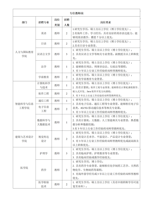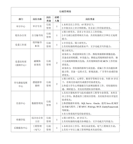 2022年我校面向社會公開招聘專任教師、行政管理崗位及相關要求見下表:
