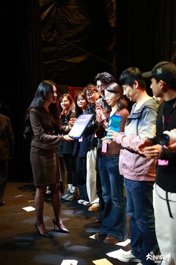 演出圓滿落幕之際,鋰洋主任代表《筆尖·心跳》劇組,滿懷誠摯地向大涼山國際戲劇節組委會以及所有到場觀眾致以最深切的謝意。他借邛海天空中的云這一充滿詩意與希望的意象,抒發感慨:只要有云,天空就會美麗;只要有戲,世界就更美好美好。大涼山戲劇節組委會代表趙建雪上臺,將象征榮譽的名牌與證書授予《筆尖·心跳》劇組,現場掌聲雷動,將這份榮耀與喜悅推向高潮。