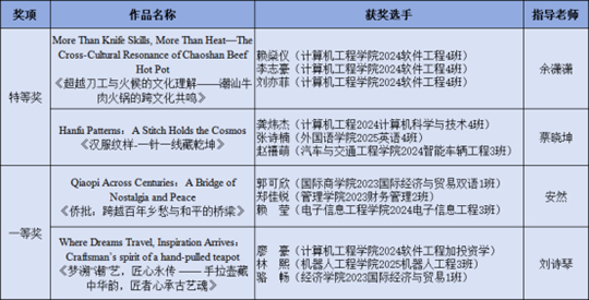 作為首次組織參與該賽事的高校,廣州城市理工學院共推薦6個作品投稿,最終收獲豐碩成果:2項作品獲省賽特等獎并成功晉級國賽,2項作品獲省賽一等獎。獲獎作品充分體現學生“敢講、會講、能講”的能力,將課堂所學的跨文化敘事框架、視聽語言技巧和AI工具運用能力,轉化為能讓不同文化背景受眾看懂的“中國小故事”,實現理論與實踐的高效結合。