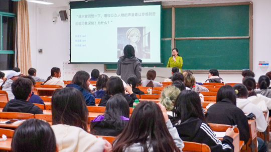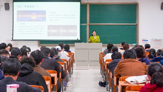 講座以“生活中哪些聲音讓人感到舒適”為切入點,逐步引導師生思考聲音在日常交流與藝術表達中的重要性。湯賀鳳老師圍繞“聲音的價值”與“聲音美容”的內涵展開講解,指出聲音作為“第二張臉”和“無形名片”的獨特作用,激發了師生對聲音訓練的濃厚興趣。她進一步闡釋,朗誦不僅是一種大聲誦讀的語言形式,更是一門融合語言、聲音與表演的綜合藝術,強調通過準確的聲音表達傳遞作品的情感與思想。