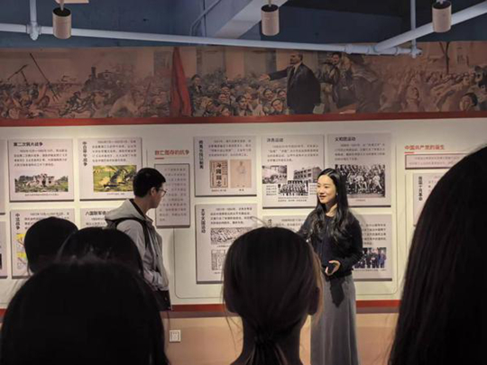 在她深入淺出的講解下,展區中靜態的史料“活”了過來,與教材中的理論知識產生了深刻的共鳴。“自魏源在《海國圖志》中提出‘東海之民,猶西海之民’的國家復興奮斗目標以來,中華民族進行了跨越幾個世紀的不懈努力,中國共產黨領導全國人民進行了跨越世紀百余年艱苦卓絕的奮斗。”在她的引導下,學生們對課程內容表現出了濃厚興趣,不時駐足觀看、認真聆聽,并積極分享感受。