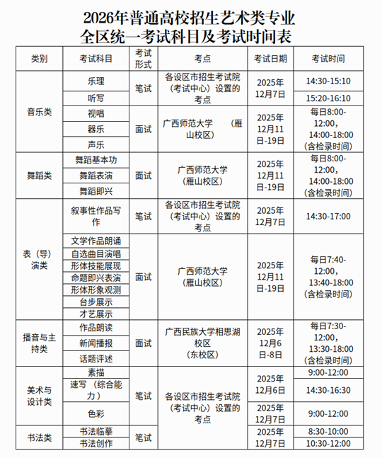 2026年普通高校招生藝術(shù)類專業(yè)全區(qū)統(tǒng)一考試(以下簡稱全區(qū)藝術(shù)統(tǒng)考),設(shè)置音樂類、舞蹈類、表(導)演類、播音與主持類、美術(shù)與設(shè)計類、書法類、戲曲類等7個考試類別,其中戲曲類采用省際聯(lián)考由相應(yīng)專業(yè)(劇種)的組考院校負責組織(另文公布),其余考試類別由我院組織,具體安排如下表: