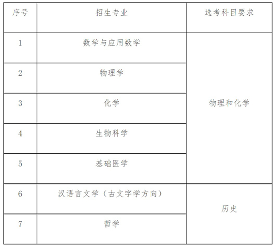 為突出基礎學科在國家關鍵領域的支撐引領作用,同時聚焦國家人才緊缺的人文社會科學領域,我校強基計劃招生專業設置如下:數學與應用數學、物理學、化學、生物科學、基礎醫學、漢語言文學(古文字學方向)﹑哲學,具體分省分專業招生計劃以報名系統內公布為準。