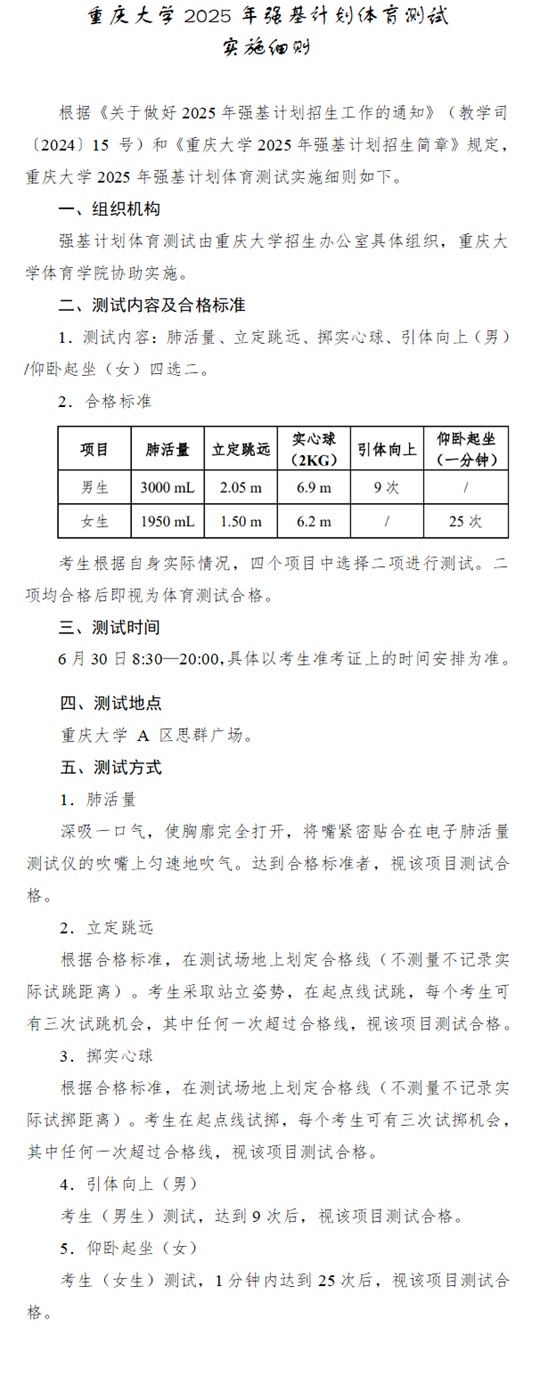 附件:重慶大學2025年強基計劃體育科目測試實施細則(點擊查看)