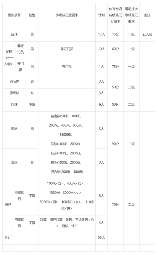 (1)籃球(男子,五人制) 項目招收一級及以上運動等級運動員,體育專項成績不低于75分。