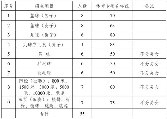 (八)文化成績錄取控制線:我校文化成績最低錄取控制線為180分。對具備一級運動員技術等級稱號的考生,文化成績最低錄取控制線為150分;對具備運動健將技術等級稱號的考生,文化成績最低錄取控制線為130分。