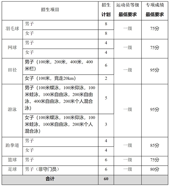 1.我校運動訓練專業招生體育專項成績錄取控制分數線:羽毛球、網球、籃球不低于75分;足球不低于80分;跆拳道不低于85分;田徑、游泳不低于95分;項目之間、性別之間專項成績錄取控制分數線不進行橫向比較。