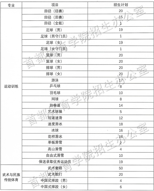 首都體育學院2025年運動訓練、武術與民族傳統體育專業分項目招生計劃