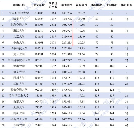 進入ESI排名前20的中國內(nèi)地高校的論文總量、高被引論文數(shù)、被引頻次等數(shù)據(jù)如下表所示。