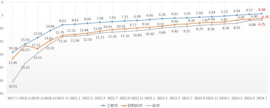 2017年以來,工程學(xué)、材料科學(xué)、化學(xué)排名百分位變動(dòng)情況