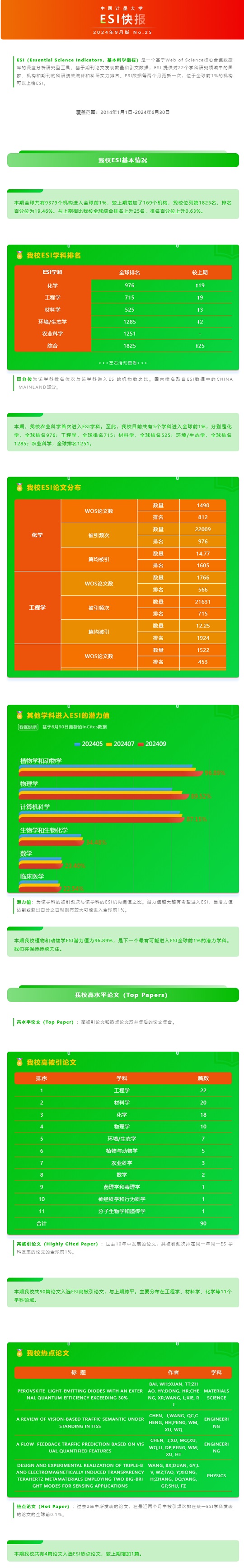 為助力中國計量大學學科建設,中國計量大學圖書館定期發布學校ESI數據。ESI是當今普遍用以評價大學和科研機構國際學術水平及影響力的重要指標,也是全球公認的評價高校學科發展的重要參考依據。9月12日最新一期ESI數據更新顯示,中國計量大學農業科學成功躋身ESI學科。至此,中國計量大學共有5個學科進入ESI全球排名前1%。本期中國計量大學ESI學科全球綜合排名為第1825名,較上期上升25名。詳情見如下快報。