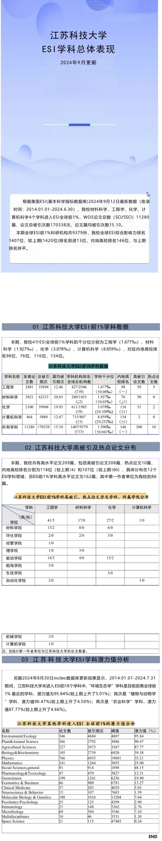 江蘇科技大學(xué)ESI學(xué)科總體表現(xiàn)(2024.9)