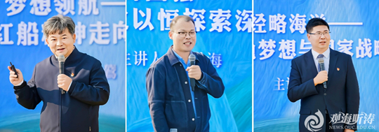黨課以“啟航—深藍—礪劍—融匯—揚帆”為清晰主線,層層遞進傳遞精神力量。黨委常委、統戰部部長陳鷟圍繞“紅船精神與藍色夢想”授課,從開天辟地的首創精神切入,闡釋“紅船精神”作為海洋強國建設的精神航標,解讀其與海大人“浩海求索”傳統的內在契合;化學化工學院教授張洪海以西北太平洋觀測體系構建為線索,講述科研人員接續奮斗、深耕遠海觀測的艱辛歷程,詮釋“持之以恒、久久為功”的科學家精神;文科處處長董躍聚焦海洋強國建設,解析國家經略海洋部署與學校使命,引導師生將個人追求融入國家海洋事業。