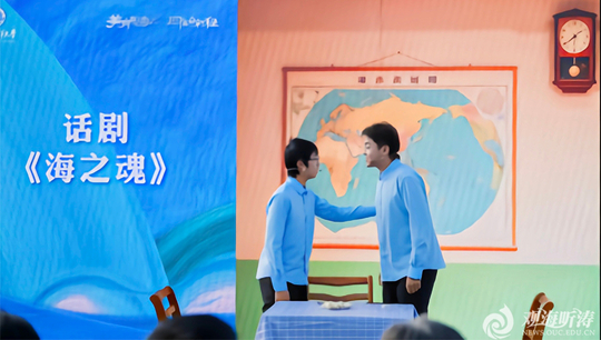 現場藝術演繹精彩紛呈,基礎教學中心藝術系學生、大學生藝術團及海鷗劇社先后帶來合唱《問道滄海》、聲韻合頌《藍色夢想》、話劇《海之魂》、情境敘事合唱《藍色暢想》等節目。《問道滄海》回溯學校百年辦學初心,《海之魂》再現革命烈士科研報國的英雄事跡,多樣藝術形式讓理論宣講更具感染力,實現了思想引領與審美體驗的同頻共振。
