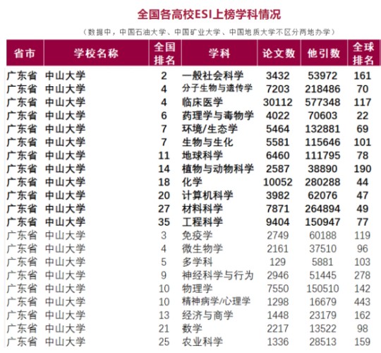 中山大學(xué)最新ESI學(xué)科上榜情況