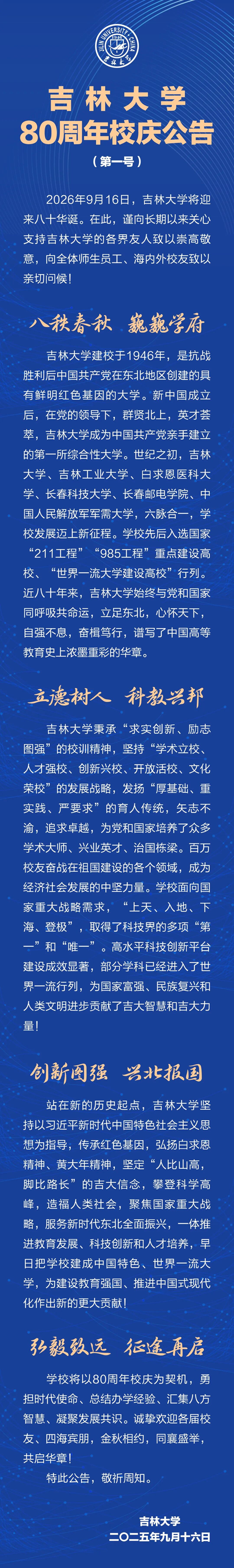 吉林大學80周年校慶公告(第一號)