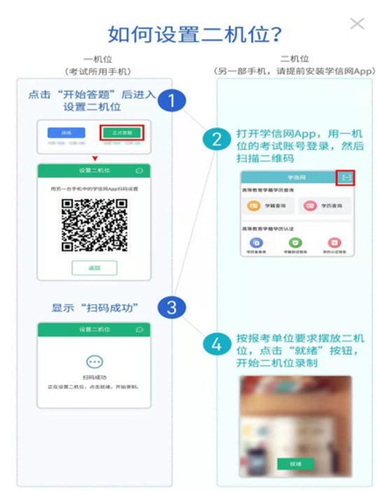 (3)“一機(jī)位”手機(jī)在點(diǎn)擊【排練】或【正式答題】后顯示設(shè)置“二機(jī)位”的二維碼。用另一部手機(jī)(“二機(jī)位”手機(jī),請(qǐng)?zhí)崆鞍惭b學(xué)信網(wǎng)APP并使用相同的賬號(hào)登錄)進(jìn)入APP首頁(yè)點(diǎn)擊右上角的掃一掃,掃碼成功并按要求擺放二機(jī)位手機(jī),點(diǎn)擊【就緒】后二機(jī)位開始錄制。“一機(jī)位”手機(jī)點(diǎn)擊【開始錄制】后,“一機(jī)位”開始錄制。