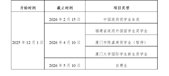 2.中國政府獎學金A類、國際中文教師獎學金等項目無須在“廈門大學境外學生申請系統”報名,其申請時間以教育部中外語言交流合作中心、國家留學基金委(含中國駐外大使館等受理機構)公布的為準。